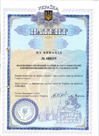 Національний університет "Одеська морська академія" (2015) Волоконно-оптичний датчик клімат-контролю для вимірювання вологості і температури. №а201306835.