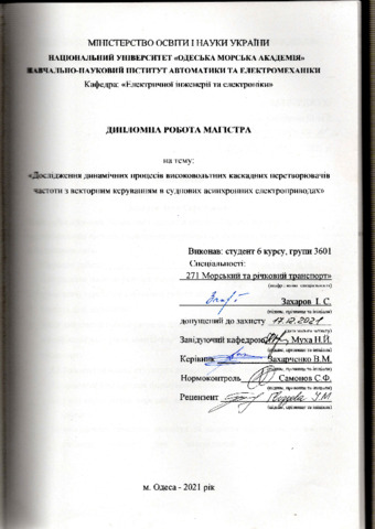 Захаров, Іван (2021) Дослідження динамічних процесів високовольтних каскадних перетворювачів частоти з векторним керуванням в суднових асинхронних електроприводах. [Кваліфікаційна (дипломна) робота]
