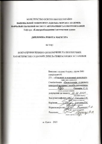Ошмарін, Євгеній (2021) Покращення техніко-економічних та екологічних характеристик суднових дизель-генераторних установок. [Кваліфікаційна (дипломна) робота]