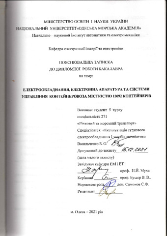Васильченко, Б.О. (2021) Електрообладнання, електронна апаратура та системи управління контейнеровоза місткістю 13092 контейнерів. [Кваліфікаційна (дипломна) робота]