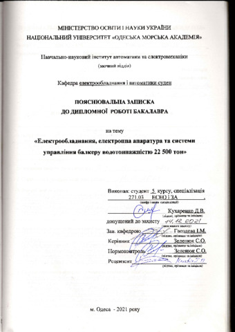 Кухаренко, Д.В. (2021) Електрообладнання, електронна апаратура та системи управління балкеру водотоннажністю 22500 тон. [Кваліфікаційна (дипломна) робота]
