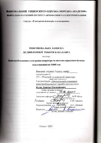 Кузів, Дмитро (2021) Електрообладнання, електронна апаратура та системи управління балкеру водотоннажністю 36000 тон. [Кваліфікаційна (дипломна) робота]