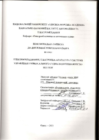 Турчанінов, С.К. (2021) Електрообладнання, електронна апаратура та системи управління універсального судна водотоннажністю 8831 тон. [Кваліфікаційна (дипломна) робота]