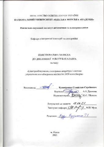 Кушніренко, Станіслав (2021) Електрообладнання, електронна апаратура та системи управління контейнеровоза місткістю 2450 контейнерів. [Кваліфікаційна (дипломна) робота]