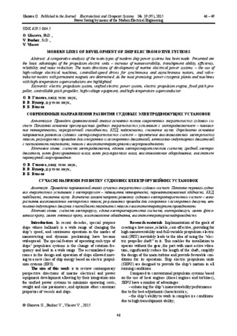 Busher, Victor V. and Glazeva, Oksana V. and Vlasov, Viktor B. (2015) Modern Lines of Development of ship Electromotive Systems. ELECTRICAL AND COMPUTER SYSTEMS, 19 (95). pp. 46-49. ISSN 22213937