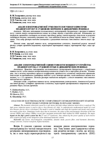 Busher, Victor and Glazeva, Oksana and Khandakji, Kamal and Zakharchenko, Vadim (2016) ANALYSIS OF ELECTROMAGNETIC COMPATIBILITY OF HIGH-POWER SOFT STARTER WITH VESSEL’S POWER NETWORK IN DYNAMIC MODES. ELECTRICAL AND COMPUTER SYSTEMS, 21 (97). pp. 17-23. ISSN 22213937