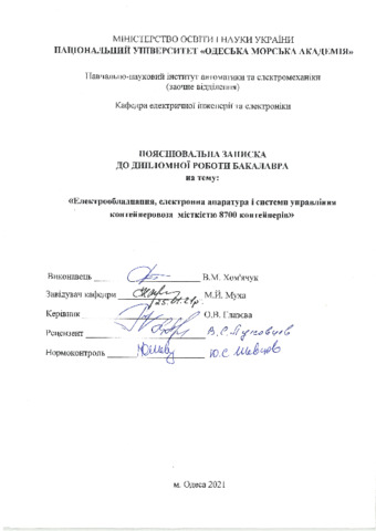 Хом’ячук, Володимир (2021) Електрообладнання, електронна апаратура і системи управління контейнеровоза місткістю 8700 контейнерів. [Кваліфікаційна (дипломна) робота]