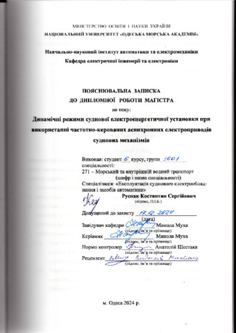 Руснак, Костянтин (2024) Динамічні режими суднової електроенергетичної установки при використанні частотно-керованих асинхронних електроприводів суднових механізмів. [Кваліфікаційна (дипломна) робота]
