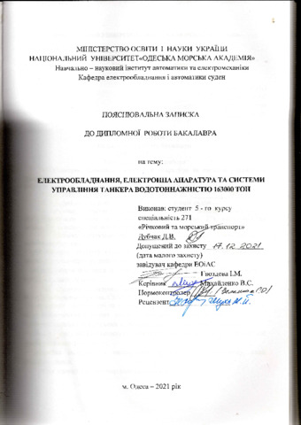 Дубчак, Дмитро (2021) Електрообладнання, електронна апаратура та системи управління танкера водотоннажністю 163000 тон. [Кваліфікаційна (дипломна) робота]