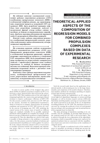Budashko, Vitalii and Golikov, Volodymyr (2017) Theoretical-applied aspects of the composition of regression models for combined propulsion complexes based on data of experimental research. Eastern-European Journal of Enterprise Technologies, 4 (3 (88)). pp. 11-20. ISSN 1729-3774