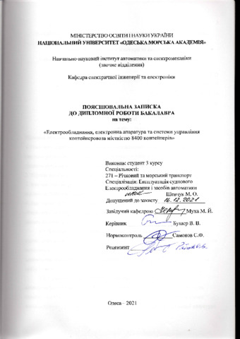 Шевчук, Максим (2021) Електрообладнання, електронна апаратура та системи управління контейнеровоза місткістю 8400 контейнерів. [Кваліфікаційна (дипломна) робота]