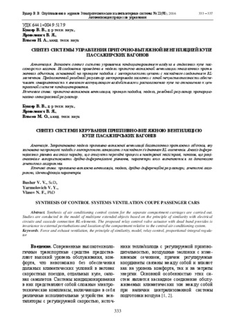 Busher, Victor V. and Vlasov, Nikolai A. and Yarmolovich, Victoria Y. (2016) SYNTHESIS OF CONTROL SYSTEMS VENTILATION COUPE PASSENGER CARS. ELECTRICAL AND COMPUTER SYSTEMS, 22 (98). pp. 333-337. ISSN 22213937
