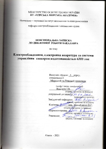 Каширін, Ілля (2021) Електрообладнання, електронна апаратура і системи управління танкером водотоннажністю 6300 тон. [Кваліфікаційна (дипломна) робота]