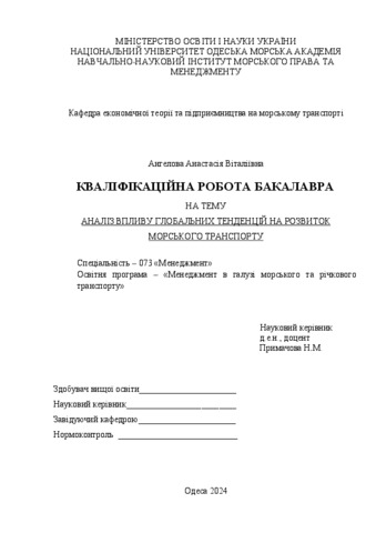 Ангелова, Анастасія (2024) Аналіз впливу глобальних тенденцій на розвиток морського транспорту. [Кваліфікаційна (дипломна) робота]
