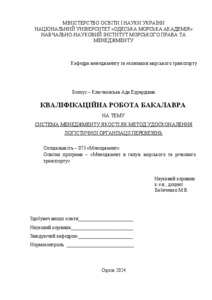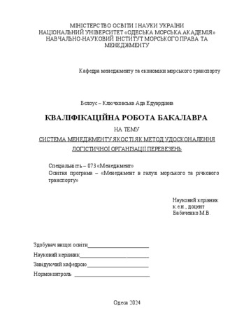 Бєлоус-Ключковська, Ада (2024) Система менеджменту якості як метод удосконалення логістичної організації перевезень. [Кваліфікаційна (дипломна) робота]