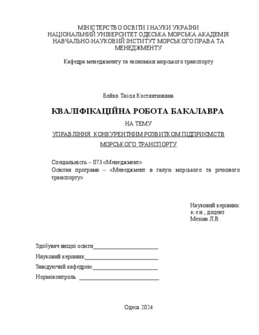 Бойко, Таїсія (2024) Управління конкурентним розвитком підприємств морського транспорту. [Кваліфікаційна (дипломна) робота]