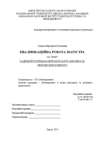 Гущіна, Маргарита (2024) Кадровий потенціал морської галузі виклики та перспективи розвитку. [Кваліфікаційна (дипломна) робота]