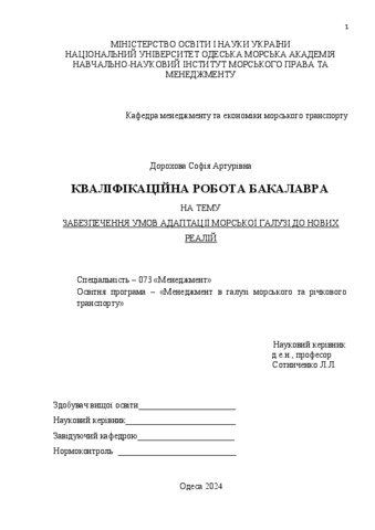 Дорохова, Софія (2024) Забезпечення умов адаптації морської галузі до нових реалій. [Кваліфікаційна (дипломна) робота]