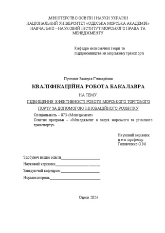 Пустовіт, Валерія (2024) Підвищення ефективності роботи морського торгового порту за допомогою інноваційного розвитку. [Кваліфікаційна (дипломна) робота]