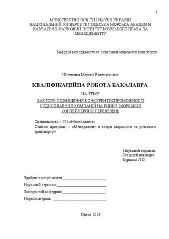 Шевченко, Марина (2024) Фактори підвищення конкурентоспроможності судноплавних компаній на ринку морських контейнерних перевезень. [Кваліфікаційна (дипломна) робота]