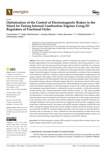 Busher, Victor and Zakharchenko, Vadim and Shestaka, Anatoliy and Kuznetsov, Valeriy and Kuznetsov, Vitalii and Nader, Stanislaw (2022) Optimization of the Control of Electromagnetic Brakes in the Stand for Tuning Internal Combustion Engines Using ID Regulators of Fractional Order. Energies, 15 (24). p. 9378. ISSN 1996-1073