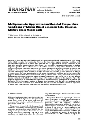 Myrhorod-Karpova, Valeriia and Hvozdeva, Iryna and Budashko, Vitalii (2022) Multiparameter Approximation Model of Temperature Conditions of Marine Diesel Generator Sets, Based on Markov Chain Monte Carlo. TransNav, the International Journal on Marine Navigation and Safety of Sea Transportation, 16 (4). pp. 779-784. ISSN 2083-6473
