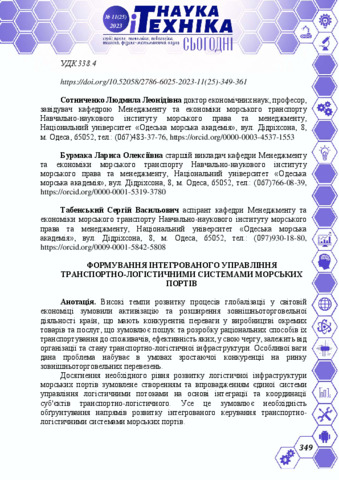 Сотниченко Л.Л., Sotnychenko L.L. and Бурмака Л.О., Burmaka L.O. and Табенський С.В, Tabensksy S.V. (2023) Формування інтегрованого управління транспортно-логістичними системами морських портів = Formation of integrated management of transport and logistics systems of seaports. «Наука і техніка сьогодні», Київ (№ 11).