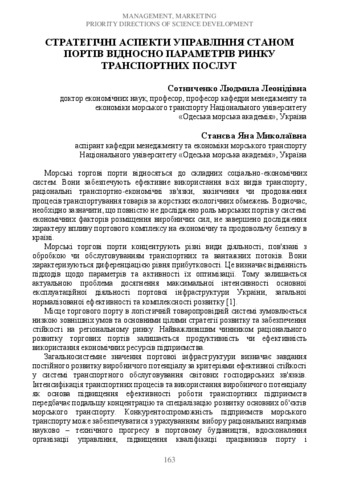 Сотниченко Л.Л., Sotnychenko L.L. and Станева Я.М., Staneva Ya.M. (2023) Стратегічні аспекти управління станом портів відносно параметрів ринку транспортних послуг = Стратегічні аспекти управління станом портів відносно параметрів ринку транспортних послуг. The V International Scientific and Practical Conference «Priority directions of science development», February 06 – 08, Hamburg, Germany. 342 p. Text Copyright © 2023 by the European Conference.