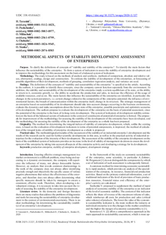 Тарасюк Н., tarasiuk H. and Пащенко О., Pashchenko O. and Мілінчук О., Milinchuk O. and Чагайда А., Chahaida A. and Сєнько О.В., Sienko O.V. (2020) Methodical aspects of stability development assessment of enterprises = Методичні аспекти оцінки розвитку стабільності підприємств. Naukovyi Visnyk Natsionalnoho Hirnychoho Universytetu, 2020, № 5.
