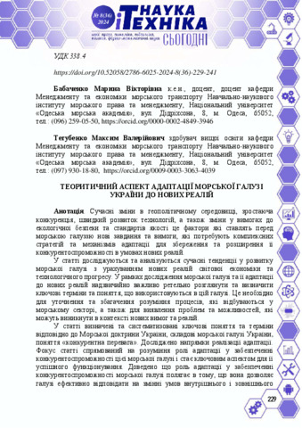 Бабаченко М.В., Babachenko M.V. and Тегубенко М.В., Tegubenko M.V. (2024) Теоретичний аспект адаптації морської галузі України до нових реалій = Theoretical aspect of adapting the maritime industry of Ukraine to new realities. Наука і техніка сьогодні, серія «Економіка»,№ 8(36) 2024. С. 229-241.