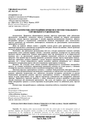 Кузьменко К.М., Kuzmenko K.M. (2021) Характеристика інтеграційних процесів в системі глобального торговельного судноплавства = Characteristics of integration processes in the global merchant shipping system. Економічні інновації: Зб. наук. праць. Том 23 № 2(79), 2021. С. 105-111..