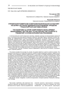 Кузьменко К.М., Kuzmenko K.M. (2023) Управління розвитком компонентів морського кластеру на шляху до налагодження інтеграційних процесів транспортної системи країни = Management of the development of maritime cluster components on the way to establishing integration processes of the country's transport system. Проблеми системного підходу в економіці. №3(92), 2023. С. 34- 38.