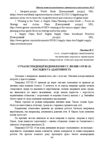 Лисенко Н.С., Lysenko N.S. (2021) Сучасні тенденції ведення бізнесу, вплив covid-19, наслідки та адаптивність = Current business trends, impact of covid-19, consequences and adaptability. Морське право та менеджмент: еволюція та сучасні виклики: Матеріали XV Міжнародної науково-практичної конференції НУ «ОМА». – Одеса: НУ «ОМА», 2021.
