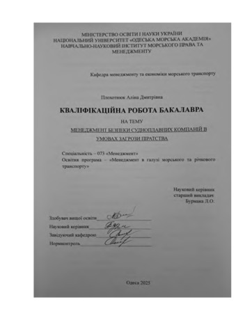 Плохотнюк, Аліна (2025) Менеджмент безпеки судноплавних компаній в умовах загрози піратства. [Кваліфікаційна (дипломна) робота]