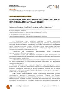 Кузьменко К.М., Kuzmenko K.M. (2024) Особливості формування трудових ресурсів в умовах автоматизації суден = Peculiarities of labor resource formation in the context of ship automation. Education and science of today: intersectoral issues and development of sciences. Materials VI International Scientific and Practical Conference, March 29 2024, Cambridge, United Kingdom.