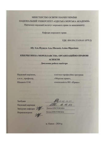 Абу Аль-Нуджум Аль-Махамід, Аліна (2024) Кібербезпека мореплавства: організаційно-правові аспекти. [Кваліфікаційна (дипломна) робота]