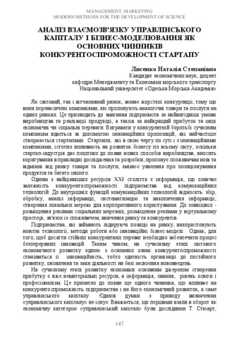 Лисенко Н.С., Lysenko N.S. (2023) Аналіз взаємозв'язку управлінського капіталу і бізнес-моделювання як основних чинників конкурентоспроможності стартапу = Analysis of the relationship between management capital and business modeling as the main factors of startup competitiveness. I Міжнародна науково-практична конференція «Modern methods for the development of science». January 09 – 11, Хайфа, Ізраїль, 2023.С. 147-151.