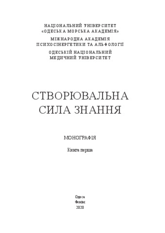 Доннікова І.А., Donnikova I.A. and Кривцова Н.В., Kryvtsova N.V. and Касперович Г.І., Kasperovich H.I. and Шевчук О.М., Shevchuk H.M. and Павлова О.С., Pavlova O.S. and Іванова Є.М., Ivanova E.M. and Натаров В.П., Natarov V.P. and Ковбан А.В., Kovban A.V. and Майборода П.А., Mayboroda P.V. (2020) Створювальна сила знання : монографія. Книга перша = The Co-Generative Power of Knowledge': monograph. Book One / авт. кол. ; відп. ред.: І. А. Доннікова, Н. В. Кривцова. – Одеса : Фенікс, 2020. – 250 с. Project Report. Фенікс, Одеса.
