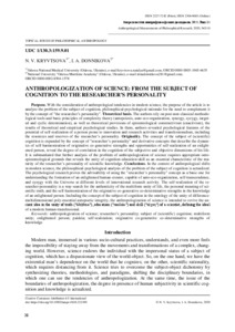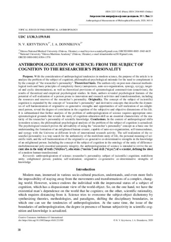 Kryvtsova, N., Кривцова, Н. and Donnikova, I., Доннікова, І. (2020) Anthropologization of science: from the subject of cognition to the researcher’s personality. Anthropological Measurements of Philosophical Research (18). pp. 20-33. ISSN 2227-7242 (Print), 2304-9685 (Online)