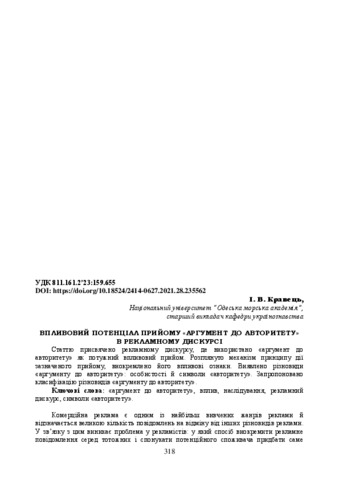 Кравець І.В., Kravets I.V. (2021) Впливовий потенціал прийому «аргумент до авторитету» в рекламному дискурсі = Influential Potential of Receiving "Argument to Authority" in Advertising Discourse. Записки з українського мовознавства (28). pp. 318-323. ISSN 2414-0627 (друкована версія) 2415-7562 (онлайн версія)