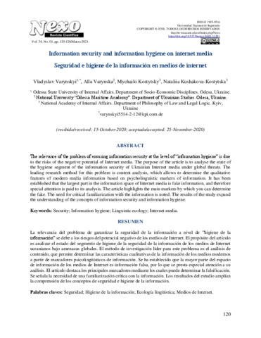 Varynskyi, V, Варинський В. and Varynska, A., Варинська А. and Kostytsky, M., Костицький М. and Kushakova-Kostytska, N., Кушакова- Костицька Н. (2021) Information security and information hygiene on internet media. Nexo Revista Científica, 34 (1). pp. 120-128. ISSN ISSN-E 1995-9516