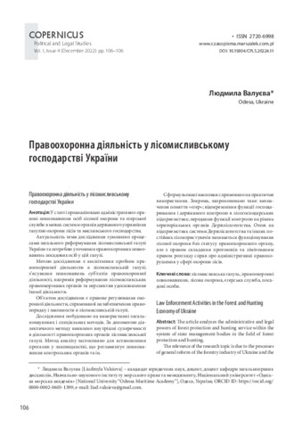 Валуєва Л.В., Valuieva L.V. (2022) Правоохоронна діяльність у лісомисливському господарстві України = Law enforcement activities in the forest and hunting economy of Ukraine. Copernicus Political and Legal Studies. Vol. 1, Issue 4. pp. 106-114.