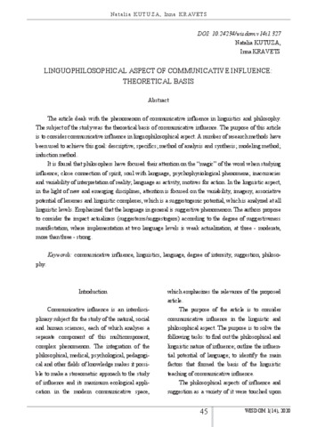Kutuza, N. and Kravets, I. (2020) Linguophilosophical Aspect оf Communicative Influence:Theoretical Basis. WISDOM, 14 (1). pp. 45-55. ISSN ISSN 1829-3824 (Print) ISSN 2738-2753 (Online)