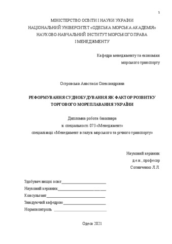 Островська, Анастасія (2021) Реформування суднобудування як фактор розвитку торгового мореплавання України. [Кваліфікаційна (дипломна) робота]