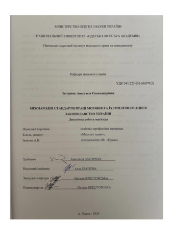 Загорняк, Анастасія (2024) Міжнародні стандарти праці моряків та їх імплементація в законодавство України. [Кваліфікаційна (дипломна) робота]