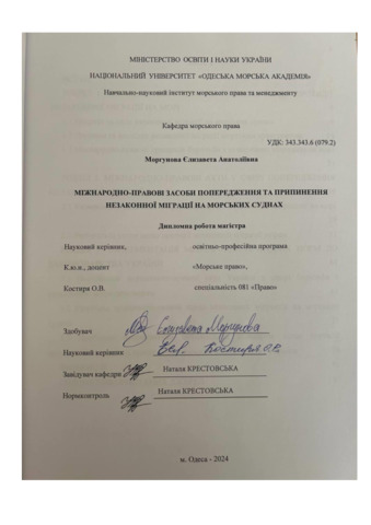 Моргунова, Єлизавета (2024) Міжнародно-правові засоби попередження та припинення незаконної міграції на морських суднах. [Кваліфікаційна (дипломна) робота]